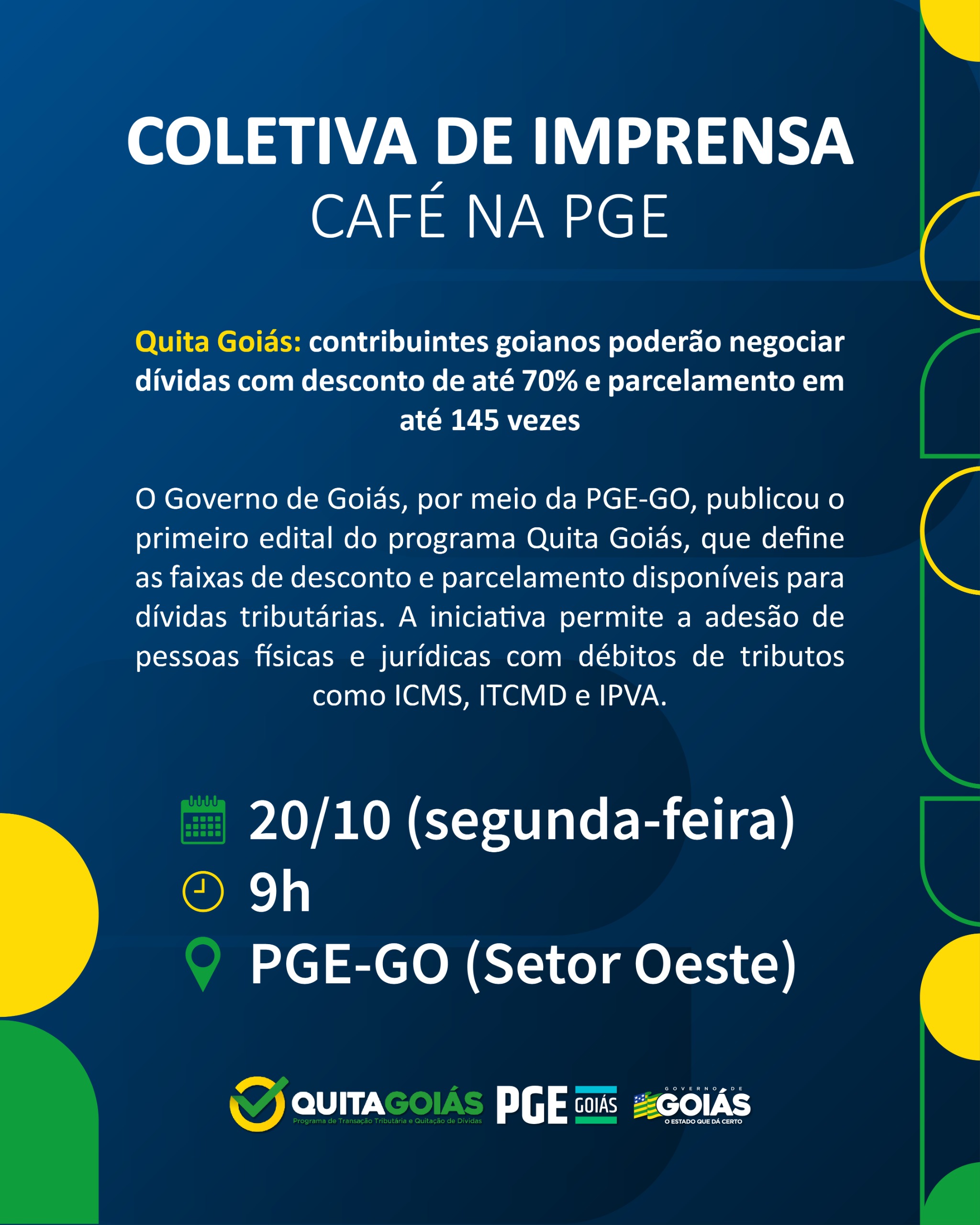 O Governo de Goiás, por meio da Procuradoria-Geral do Estado (PGE-GO), publicou o primeiro edital do programa Quita Goiás, que define as faixas de desconto e parcelamento disponíveis. A iniciativa permite a adesão de pessoas físicas e jurídicas com débitos de tributos como ICMS, ITCMD e IPVA.